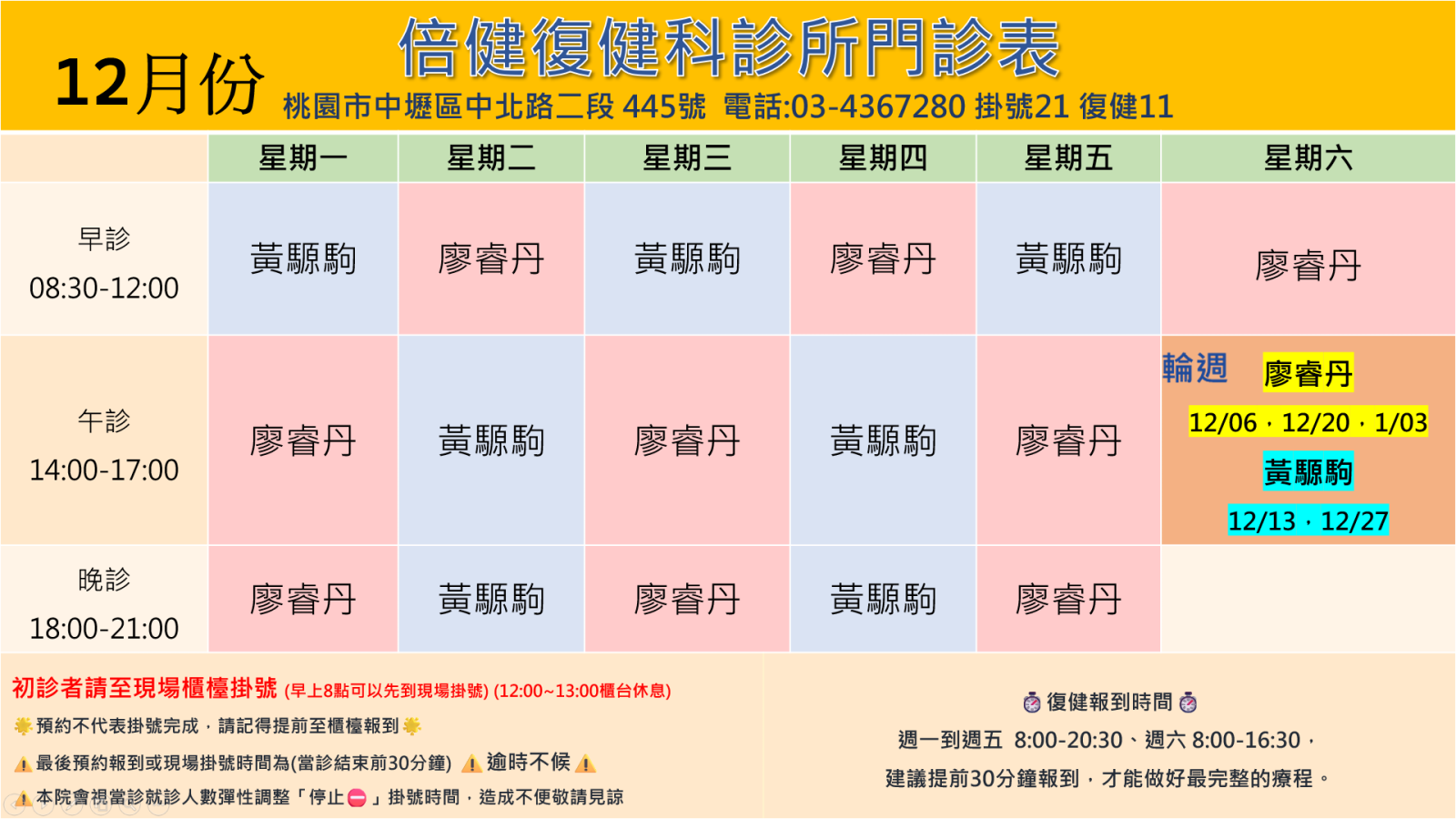 @最後預約報到或現場掛號時間為(當診結束前30分鐘) (逾時不候)